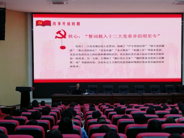 曾洁超老师围绕为什么要进行入党宣誓、入党誓词的历史沿革、入党誓词的内涵以及入党誓词践行路径等层面进行讲授。曾老师生动的讲述了在建党初期至土地革命战争时期、抗日战争时期、新中国成立前后和党的十二大以来不同阶段的入党誓词,追根溯源并逐字逐句的分析,全面系统的阐述了入党誓词对共产党员的重要意义。他指出,入党誓词的演变反映了我们党从不放松党的建设,反映了我们党善于把握不同历史时期的主题和要求来发展党员,反映了我们党高度重视对党员进行党性教育和理想信念教育,反映了我们党与时俱进。曾老师在专题党课中强调入党重在思想入党,誓词需一生践行。每位党员都要牢记入党誓词,不断重温、时刻对照、深刻自省,从中汲取加强党性修养的不竭动力,坚守誓言,履行承诺,努力做一名新时代的合格共产党员。