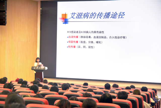 在接下来的预防艾滋的宣传讲座中,韦茂就“什么是艾滋病”、“为什么要关注艾滋病”、“艾滋病的传播途径”以及“如何预防和检测艾滋病”等问题深度解读艾滋病的相关知识。通过一串串触目惊心的数字和一件件令人不寒而栗的案例,我们意识到艾滋病原来就在我们身边,预防艾滋刻不容缓。“预防艾滋病并不只是口头说说,而是需要我们每个人落实到行动中,养成良好的生活习惯至关重要。”韦茂指出青少年应该洁身自好,警惕高危行为,这样才能高效预防艾滋病,为社会营造良好的预防艾滋氛围。