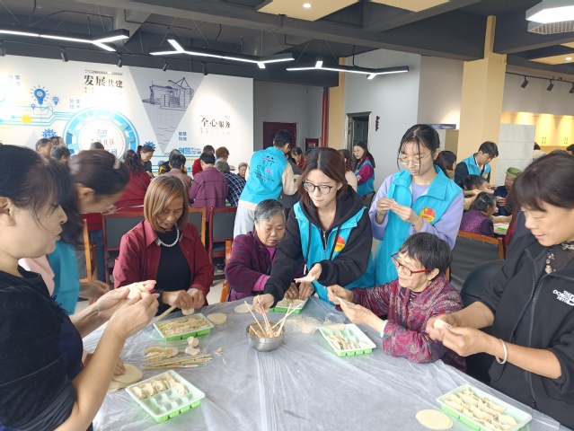 最后,志愿者和社区居民们共同参与了包饺子活动。大家分工明确,有条不紊地完成了和馅、擀皮、包馅、煮饺子等一系列工作。现场欢声笑语不断,充满着快乐和温馨的氛围。包饺子不仅锻炼了老人们的动手能力,还让老人们感受到了社会的温暖和关爱,增强了老人们对社区的凝聚力和归属感。