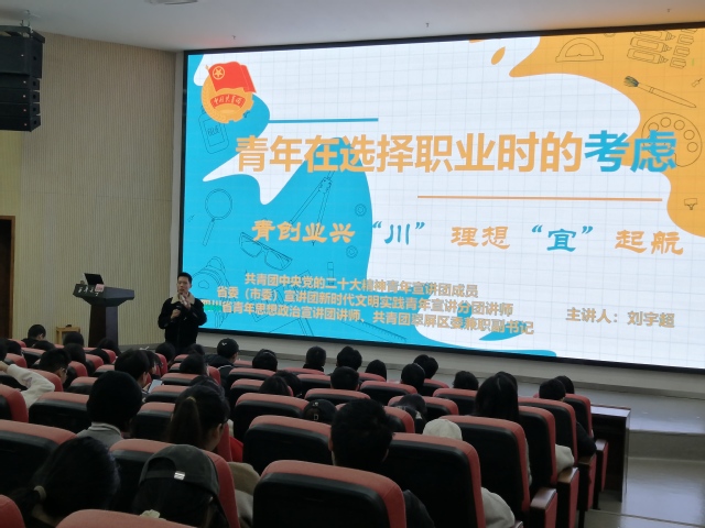 为了提升青年就业适应力和创新力,宜宾校区于11月19日上午在1教101报告厅成功开展青春就业大讲堂讲座,在宜宾市团市委的大力支持下,邀请到团市委青年宣讲师刘宇超给同学们开展讲座。这场讲座旨在助力青年人拓宽就业视野,激发创新思维,为未来的职业道路铺设坚实的基础。