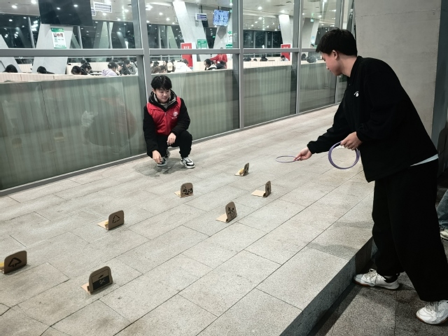 增强垃圾分类意识,垃圾分类知识竞答。同学们在志愿者的引导下记忆垃圾分类宣传单上的相关知识,正确判断并向带有垃圾分类标识的摆件套圈,活动现场气氛热烈,同学们参与度较高、互动性较强。