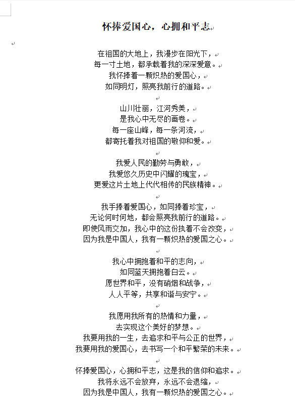 当前,我国正处在实现中华民族伟大复兴的关键时期,为激发广大人民群众的爱国热情和和平愿望,增强青年学生的民族自豪感和自信心,以文促情,通过文字的形式抒发爱国情怀和珍惜和平愿望,宜宾校区于11月中旬至12月初,开展了“怀捧爱国心,心拥和平志”征文比赛。