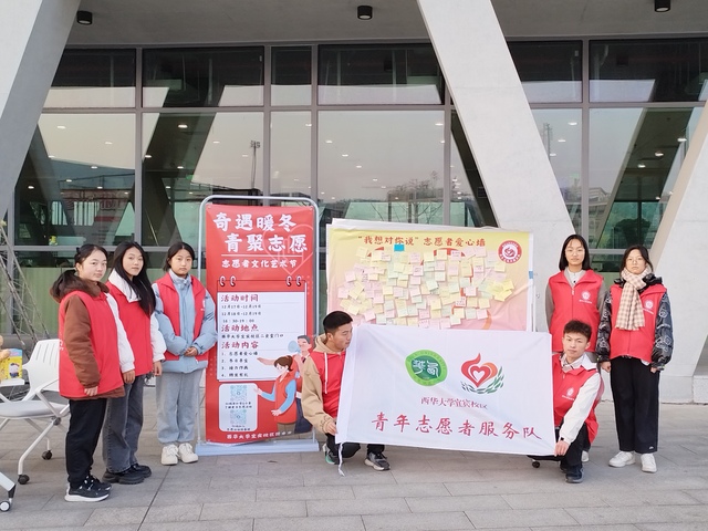 弘扬乐于助人、无私奉献的精神和“奉献、友爱、互助、进步”的志愿者精神,20231216日至19日校区青年志愿者服务队在校区二食堂门口开展了以“奇遇暖冬,青聚志愿”为主题的志愿者文化艺术节系列活动。本次活动面向宜宾校区全体师生,由线上和线下两部分组成。