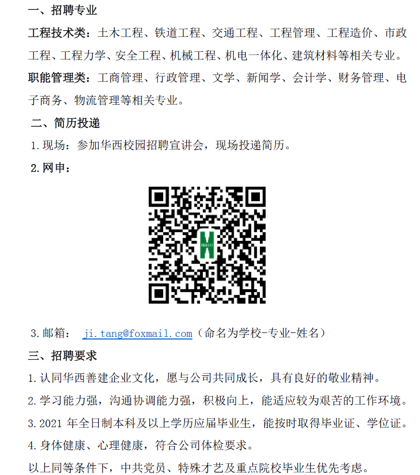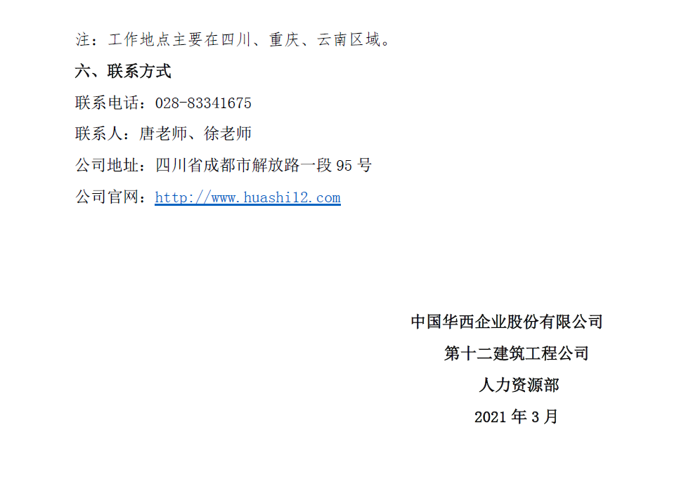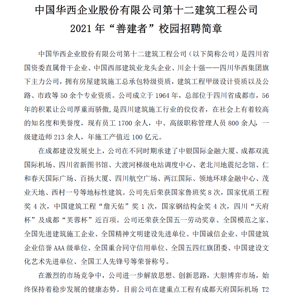 【线上招聘】中国华西企业股份有限公司第十二建筑工程公司