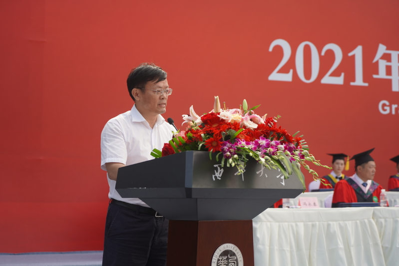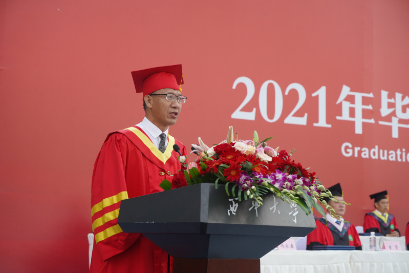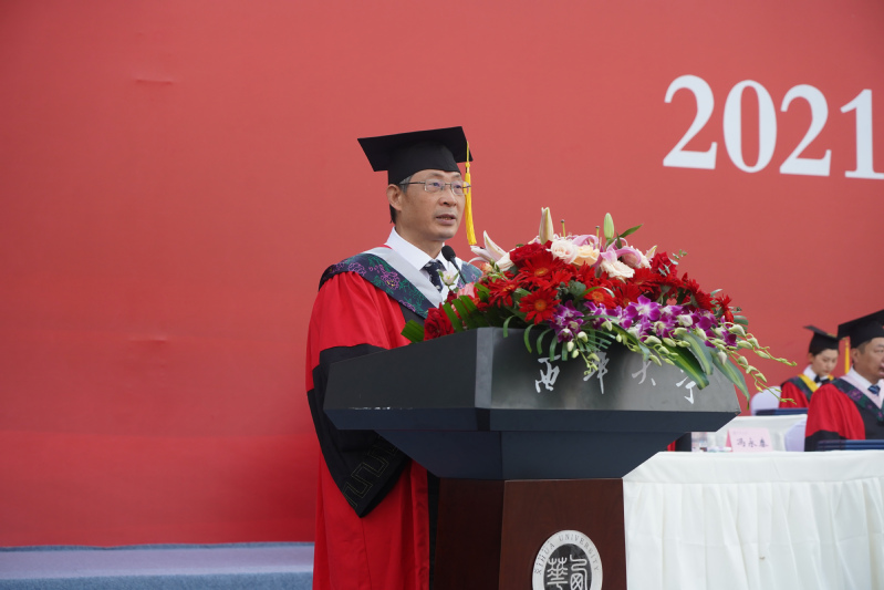 校长刘树根发表了题为《从百年党史中感悟青年使命 在奋斗征程上担当时代责任》的讲话。刘树根回顾了四年来宜宾校区的发展,千亩校园从无到有,座座高楼拔地而起。他说道,“今天是宜宾校区建成投入使用以来首次举行毕业典礼暨学位授予仪式,宜宾市相关领导欣然拨冗出席,和我们共同见证这一盛大仪式,共同见证你们从宜宾扬帆起航的重要时刻,共同见证校地双方凝心聚力、精诚合作的办学成果......”