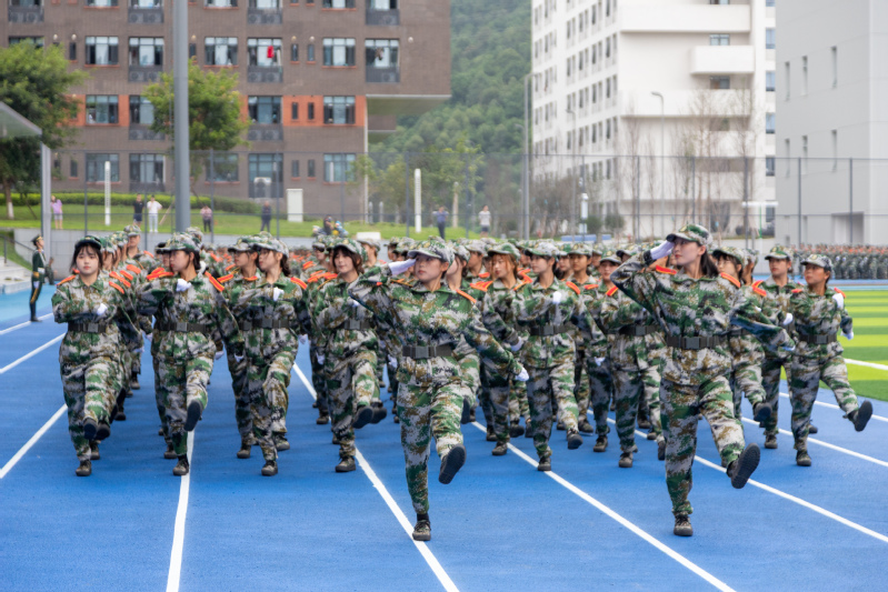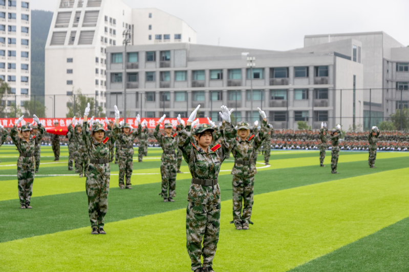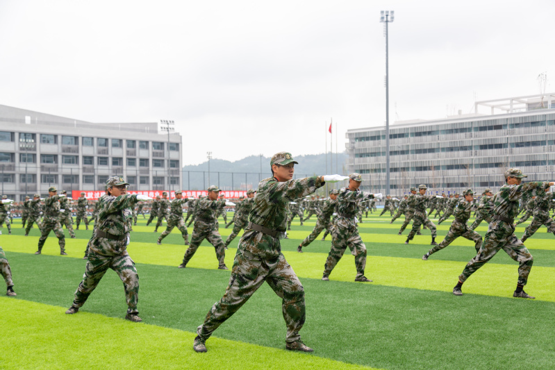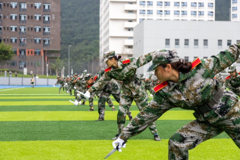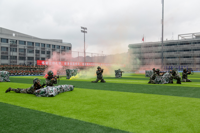 在庄严的国歌声中,五星红旗冉冉升起,拉开了本次结训典礼的序幕。分列式开始后,各方队喊着响亮的口号,昂首挺胸,迈着整齐的步伐依次走过主席台,以挺拔的军姿和高昂的士气交上了一份令人满意的答卷。拳术方队、棍术方队的男同学步法铿锵有力、动作干净利落,尽显军人风采;匕首操方队女生巾帼不让须眉,英姿飒爽,展现热血青春;战术方队的同学们脸上抹着迷彩油,展示实战演练中的匍匐、翻滚等高难度动作;手语操方队在《国家》的歌声中,排列出了西华、五角星等字样,向祖国深情告白,献礼中国共产党成立一百周年。教官们带来的擒敌术,包含了踢、打、摔、擒等技法,动作行云流水,刚劲有力,赢得了现场观众的阵阵喝彩。