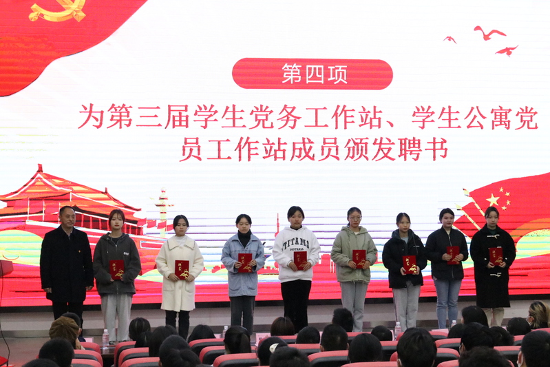 大会在《没有共产党,就没有新中国》歌声中拉开序幕。第二届党务工作站学生代表严涵发言,浅谈党务工作站的由来及加入初衷和一年的收获,对新一届工作者提出期望与祝福。魏平强宣布了第三届学生党务工作站成员名单,对新加入的25名新成员表示祝贺。第三届学生党务工作站、学生公寓党员工作站学生代表吕琦发言,提出了新一年的工作计划,承诺学习上一届学长学姐,做好本职工作。在第三届党务工作站新成员全体起立宣誓后,陆跃文总结讲话。他对大会顺利召开表示热烈祝贺,对第二届工作成员表达深切关心和衷心感谢,对第三届新成员提出了要求与期许,希望新成员不断提高思想认识,坚定理想信念,树立群众观念,发挥先锋模范作用。换届大会结束后,所有领导老师与第二届、第三届党务工作站成员合影留念。
