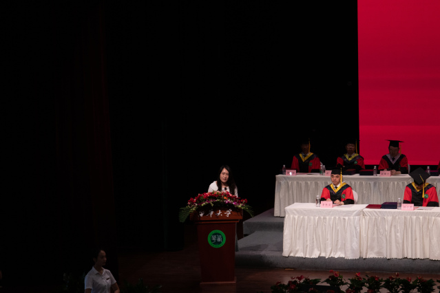 教师代表刘小宇在致辞中回忆自己与同学们两年的美好时光,表示很高兴见证了同学们的成长,并真挚希望同学们不忘初心,莫负光阴,发挥青年人的力量,在自己的岗位上争做民族复兴的时代新人。