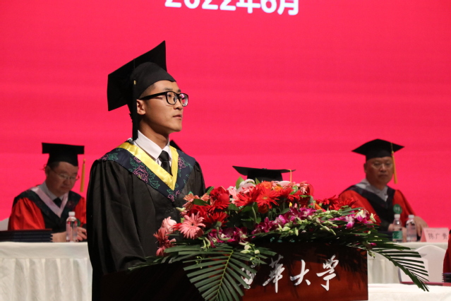 机械工程学院的张科代表全体毕业生向老师、父母和同学致以最诚挚的感谢。他怀揣着对母校崇高的敬意表示他将带着坚定不移的决心、果敢刚毅的品格、家国天下的情怀和为理想不懈奋斗的热血去翱翔天际、乘风破浪。