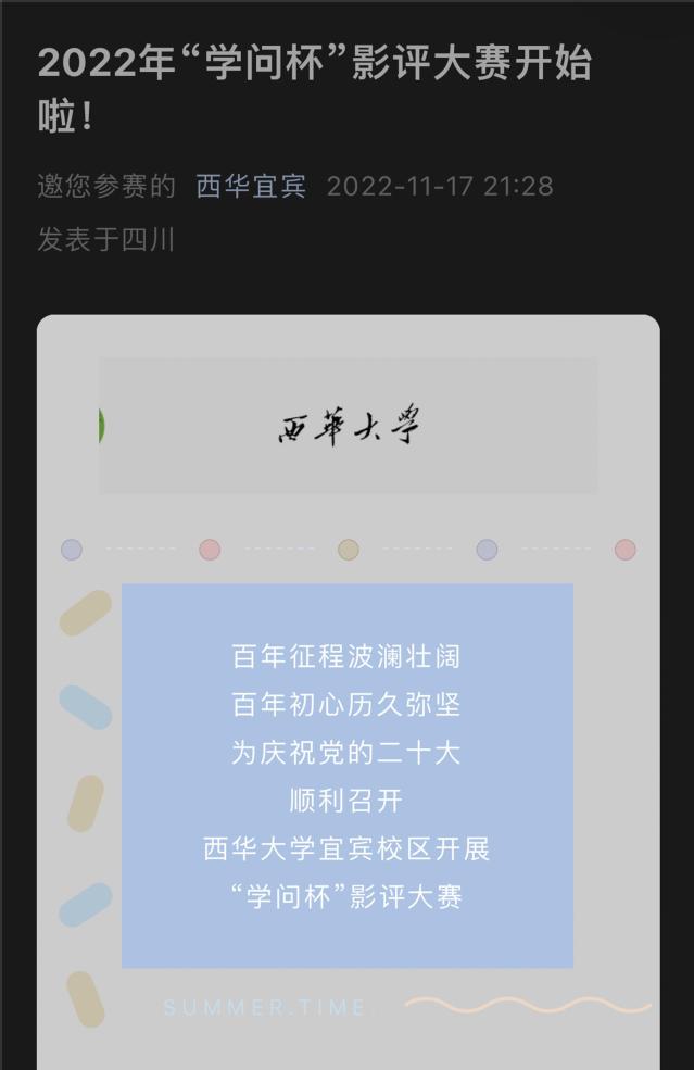 百年征程波澜壮阔,百年初心历久弥坚。为庆祝党的二十大顺利召开,呼吁同学们传承红色基因、争做时代新人。由宜宾校区Betway必威西汉姆联官方网站办公室(校区团委)主办,汽车与交通学院承办的开展“学问杯”影评比赛于11月17日至12月9以线上投稿、评选的形式成功落下帷幕。