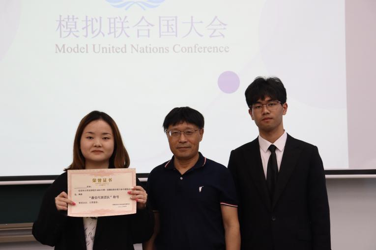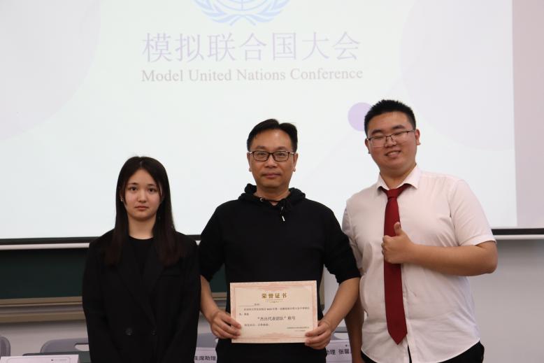 会议结束之后,由评委老师进行现场打分,评选出了最佳代表团队(Best Delegate)、杰出代表团队(Outstanding Delegate),分别由王朝培老师和王阿秋老师进行颁奖。颁奖结束之后,王朝培老师和王阿秋老师分别对此次模拟联合国大会和同学们的表现作出了肯定和赞扬。