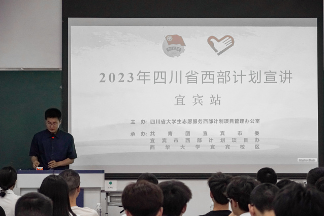 为贯彻落实党的二十大精神,切实做好大学生志愿服务西部计划宣传工作,大力弘扬“奉献、友爱、互助、进步”的志愿者精神,号召广大青年学子积极投身西部计划志愿服务工作,宜宾校区于4月20日在第一教学楼102教室召开西部计划宜宾市地方项目宣讲会。宜宾市西部计划项目专员卢文龙、筠连县西部计划项目办负责人高邦耀、翠屏区西部计划项目办专员姜桃出席本次宣讲会。