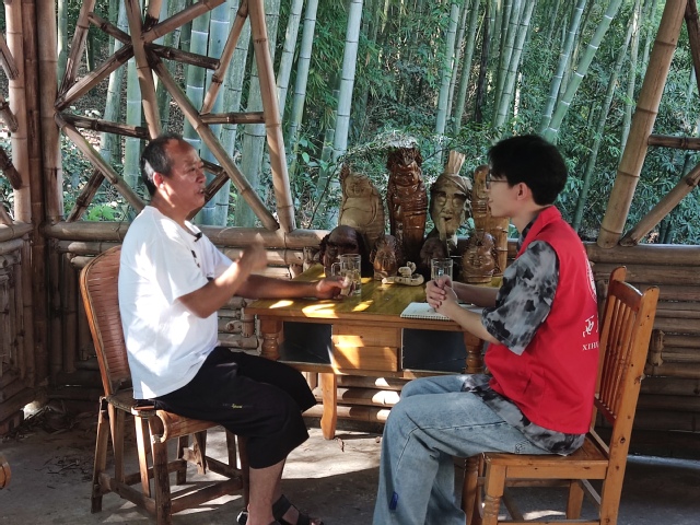 7月13日,实践团队成员对竹根雕手艺人宗从华师傅进行了访谈,宗师傅在访谈中提到竹根雕是以生长在泥底下的竹根为原料雕刻加工而成的手工艺术品,具有独特自然的制作工艺,质朴高雅的审美特征。宗师傅说道:“在上世纪九十年代,竹根雕手工制品曾一度畅销。但随着时代的发展进步,机械化的迅速普及以及消费者消费观念的转变,纯手工制作的竹根雕制品逐渐不再像之前那样受到消费者的青睐。”面对竹根雕技艺传承问题宗从华师傅表示:自己每天想的都是怎么传承竹根雕工艺。他会活到老学到老,不断精进竹根雕技术,为竹产业发展贡献出自己的力量。